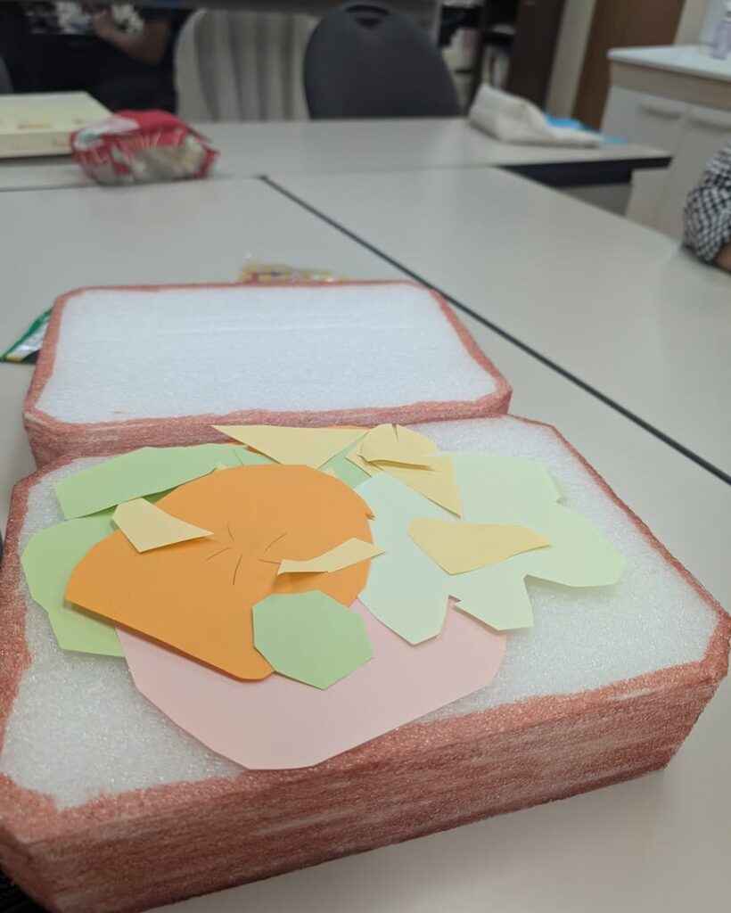 今日は発泡スチロールと折り紙で作った、まるで本物のようなサンドイッチを見せてくれました。